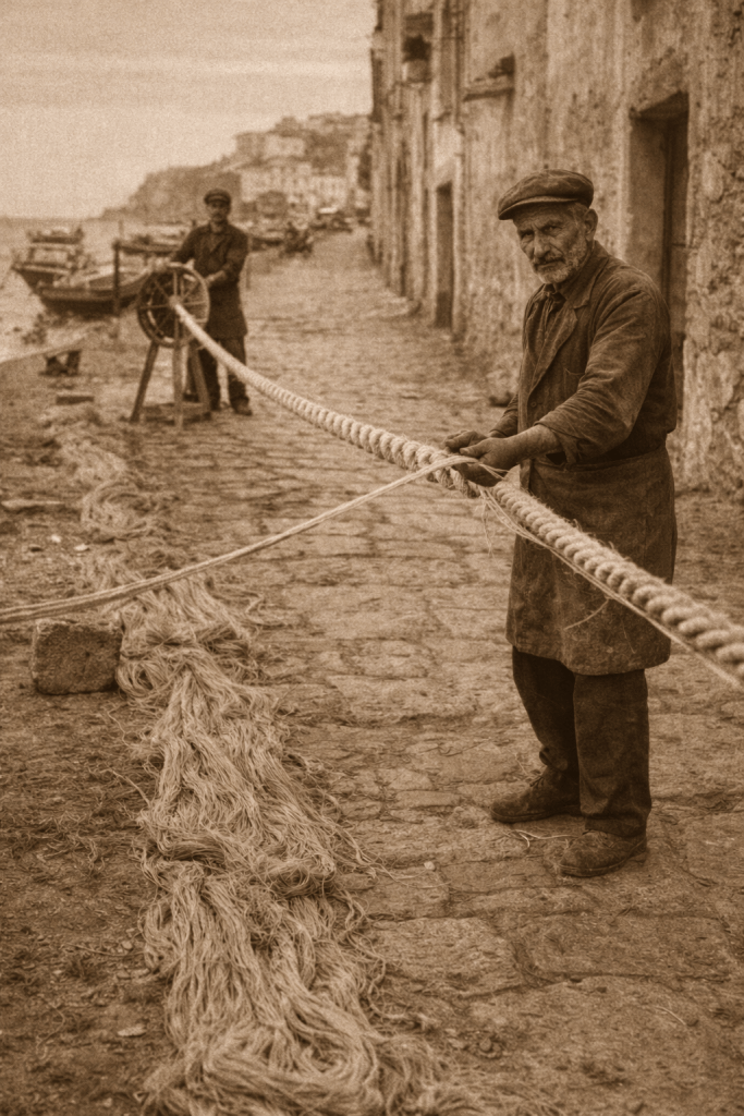 Il lavoro si svolgeva all’aperto: fili di canapa o fibra vegetale venivano intrecciati a mano, tirati e fatti ruotare con semplici attrezzi. Era un mestiere di forza e precisione, che richiedeva spazio e pazienza.