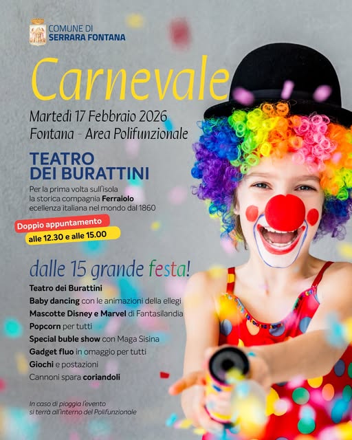 Serrara Fontana si prepara a vivere una giornata all’insegna dell’allegria e della fantasia con il Carnevale 2026, in programma martedì 17 febbraio presso l’Area Polifunzionale di Fontana. Un appuntamento pensato soprattutto per i bambini e le famiglie, che trasformerà il pomeriggio in una vera e propria festa di colori, musica e spettacolo.