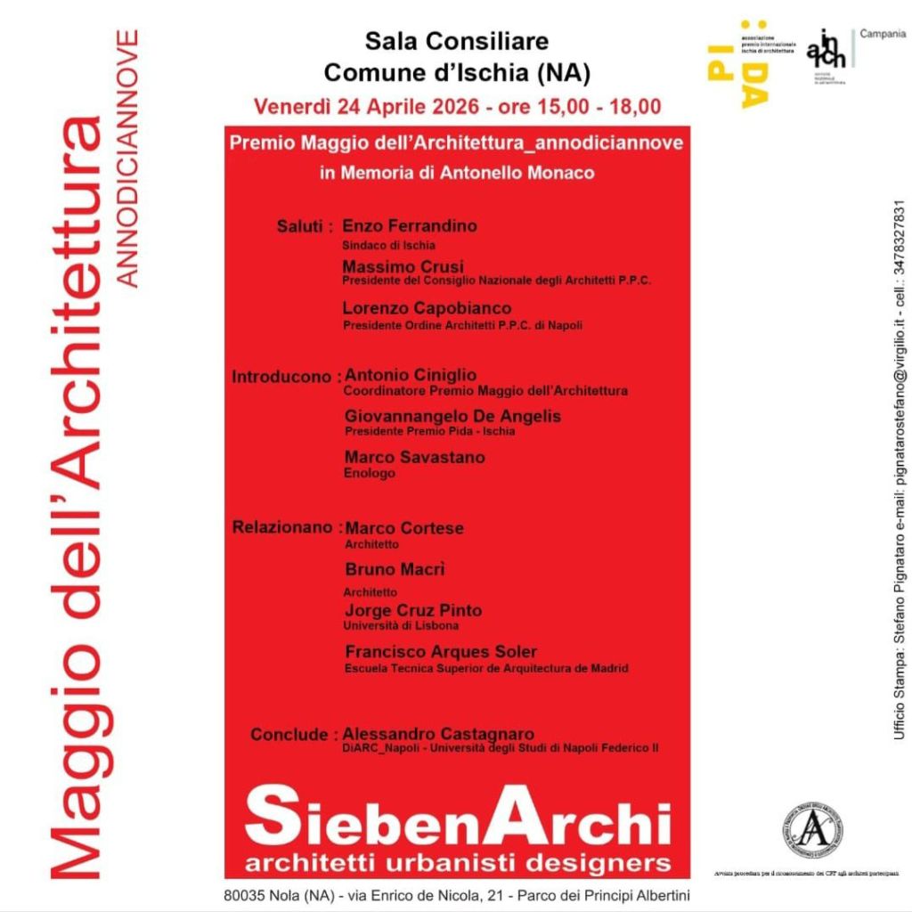 ISCHIA – Un appuntamento che unisce riflessione culturale e memoria. Venerdì 24 aprile, dalle ore 15:00 alle 18:00, presso la Sala Consiliare del Comune d’Ischia, si terrà il convegno “Maggio dell’Architettura_annodiciannove”, promosso dall’Associazione PIDA – Premio Internazionale Ischia di Architettura, in collaborazione con SiebenArchi – Architetti Urbanisti Designers.
